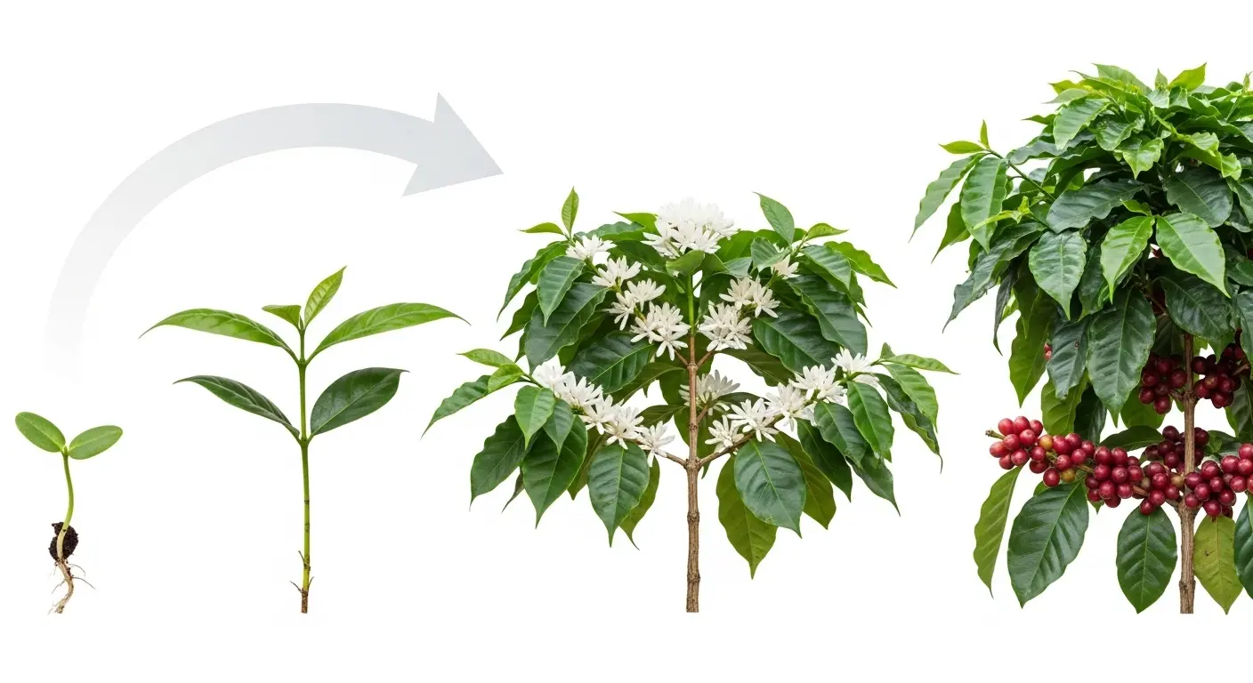 コーヒーの木が実(コーヒーチェリー)をつけ始めるまでには、一般的に植え付けから3年~5年ほどの時間が必要です。