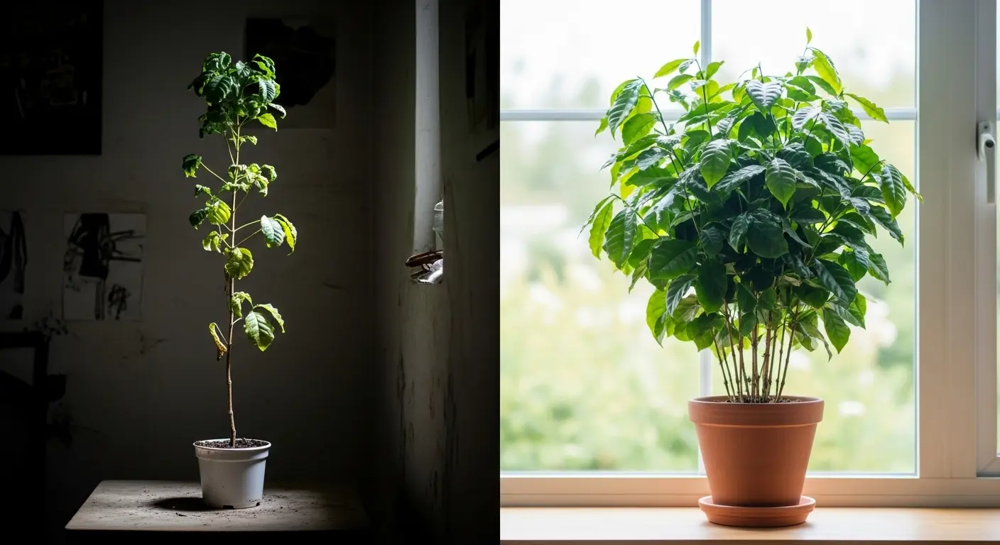 コーヒーの木を室内で育てていると、幹や枝が間延びしてひょろひょろとした頼りない姿になってしまうことがあります。この主な原因は日照不足です。