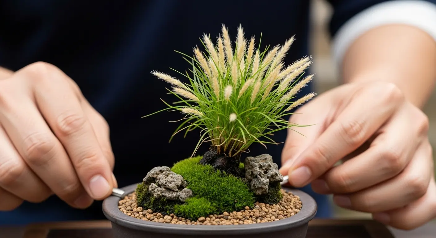 ススキの盆栽は、主に「ヤクシマススキ」などの極矮性種を使って作られます。小さな鉢の中で、自然の雄大なススキの姿を凝縮して表現するのが醍醐味です。