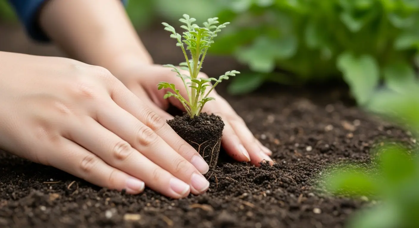 - 植え穴に苗を置いたら、株元が少し高くなるように土を寄せ、軽く手で押さえて固定する。