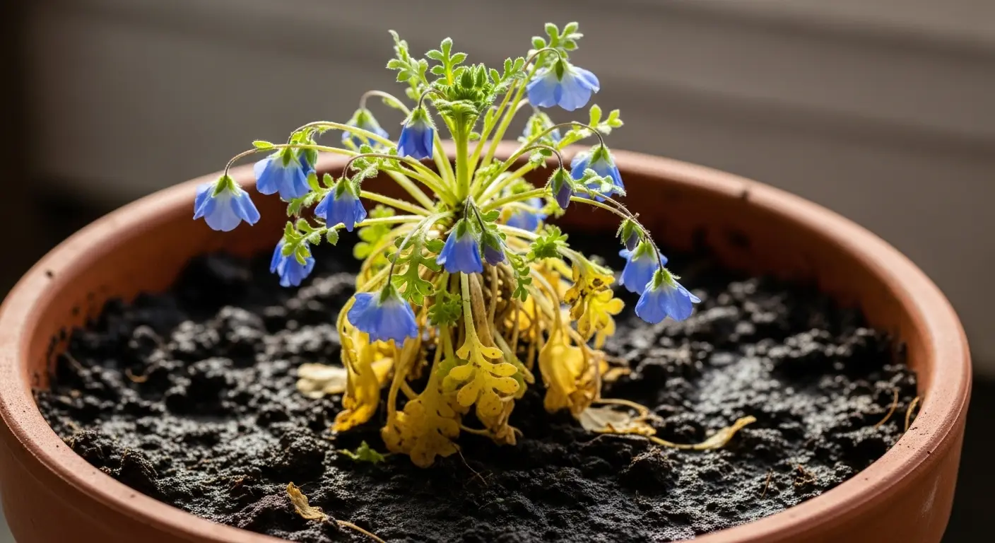 最大の原因は、水のやりすぎによる過湿です。ネモフィラは乾燥気味の環境を好むため、土が常にジメジメと湿っている状態が続くと、根が呼吸できなくなり腐ってしまいます。特に、水はけの悪い土を使っている場合や、鉢皿に水が溜まったままだと、根腐れのリスクは一気に高まります。