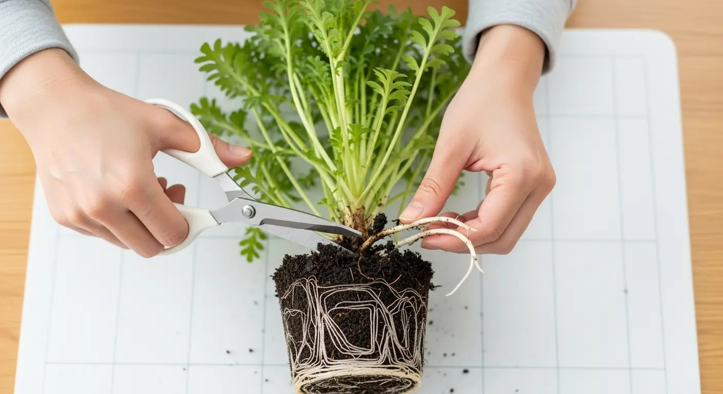 - 株を鉢からそっと抜き、古い土を優しく落とす。