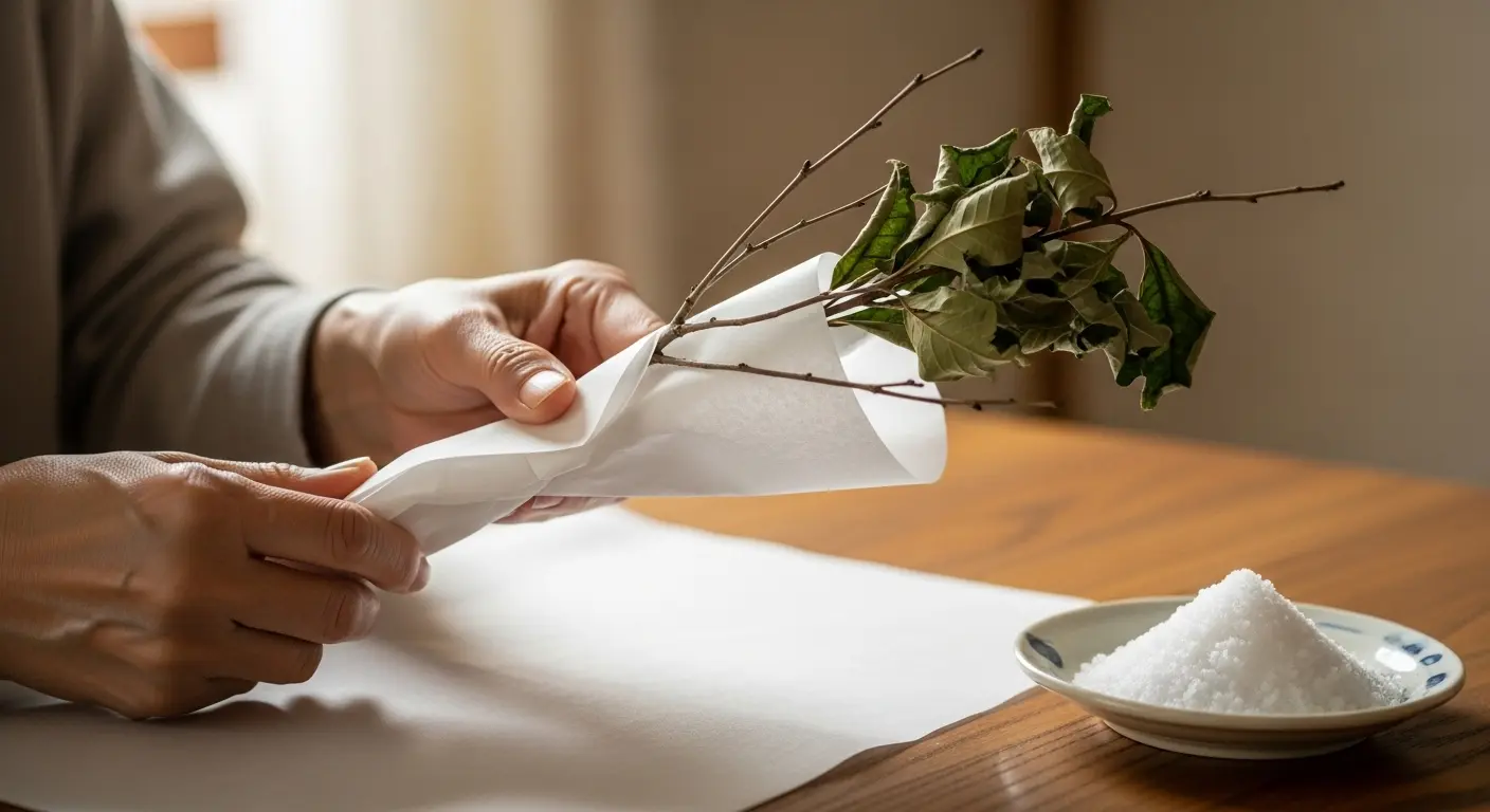 最も手軽で一般的な方法です。枯れた榊に感謝の気持ちを伝えながら、清めの塩を振りかけ、白い半紙やきれいな紙に包んでから、他のゴミとは別の袋に入れて処分します。 - 庭の土に還す