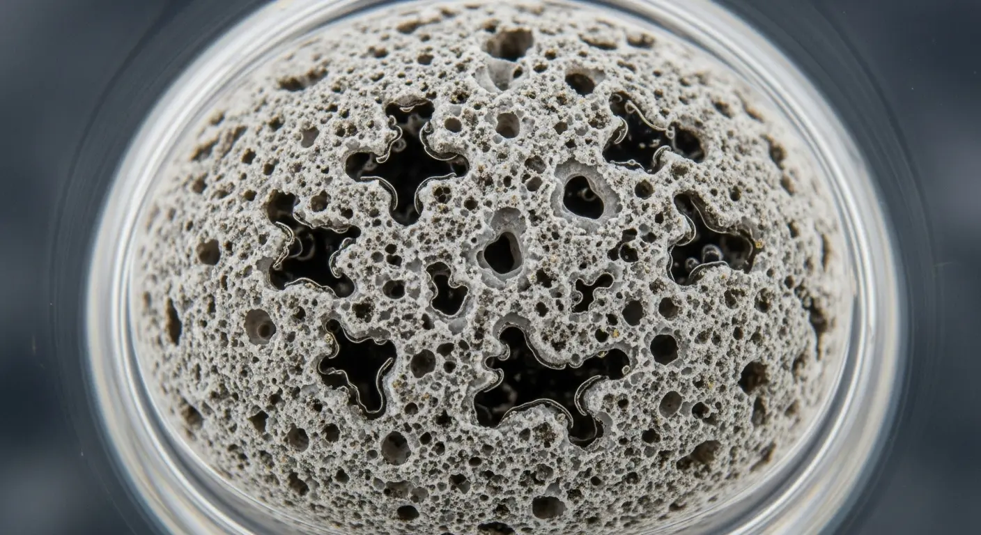 ゼオライトの最大の特徴は、その結晶構造にあります。内部には目に見えないほど微細な穴(多孔質構造)が無数に存在しており、この構造がゼオライトに様々な機能をもたらしています。言ってしまえば、非常に小さなスポンジのような構造をイメージすると分かりやすいかもしれません。