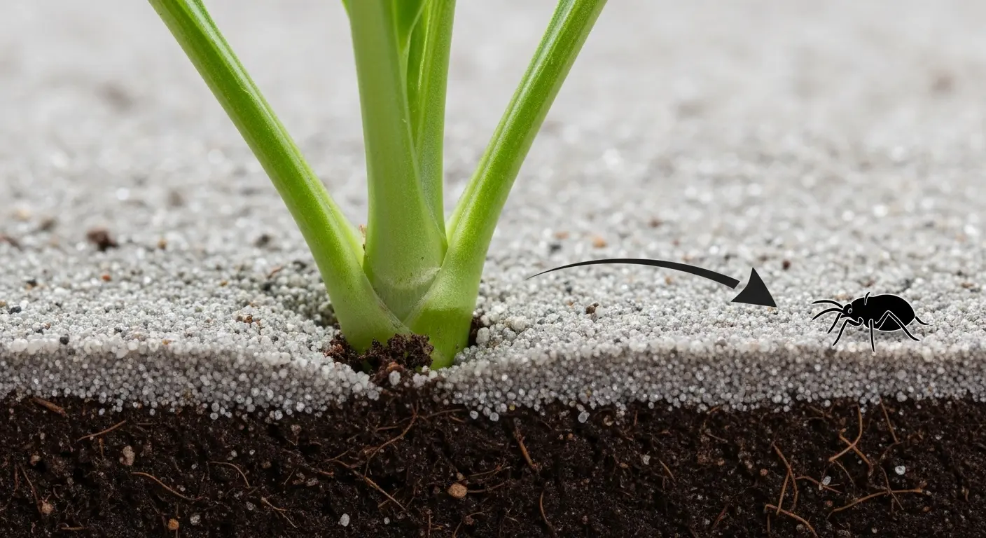鉢土の表面をゼオライト(特に化粧砂として使われる細かい粒のもの)でマルチング(覆うこと)すると、土壌表面の余分な湿気をゼオライトが吸収してくれます。これにより、土の表面が乾いた状態に保たれやすくなり、湿気を好むコバエやトビムシ、そして一部のダニ類が寄り付きにくい環境を作ることができます。 - 株元の通気性を良くする