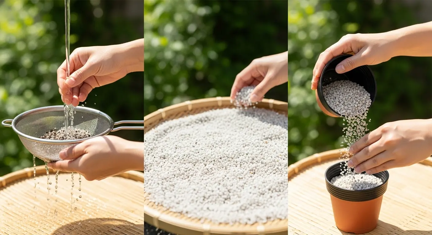 この処理を行うことで、ゼオライトを再び土壌改良材や鉢底石として使用することができます。