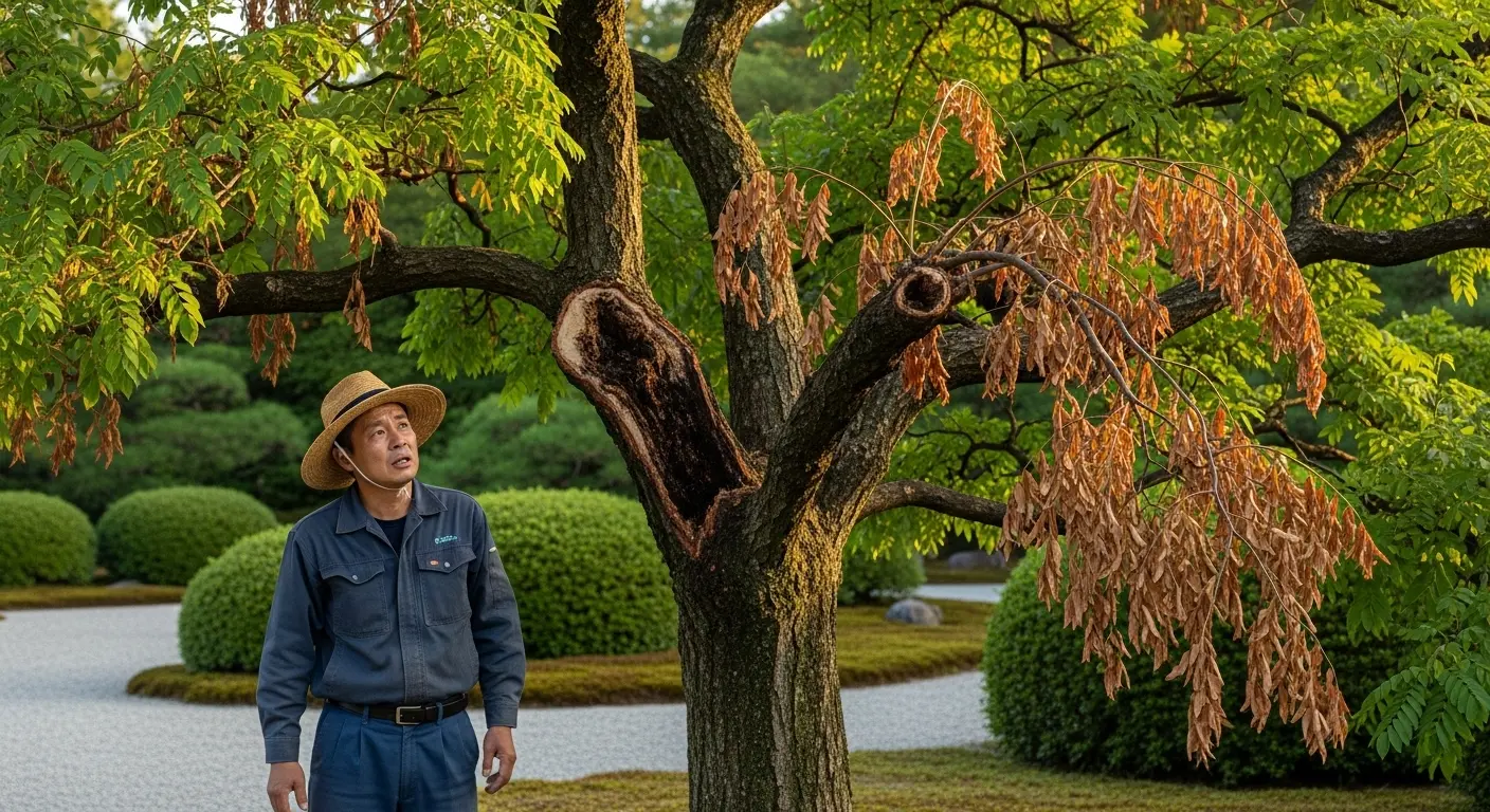 この「カイガラムシの発生」から「すす病の蔓延」、そして「木の衰弱」という負の連鎖は、ねむの木では頻繁に見られる光景です。樹液を吸われて弱ったところに、光合成まで阻害されるため、木は深刻なストレス状態に陥ります。弱った木は、剪定によるダメージからの回復も遅くなり、ますます枯れ込むリスクが高まるという悪循環に陥ってしまうのです。