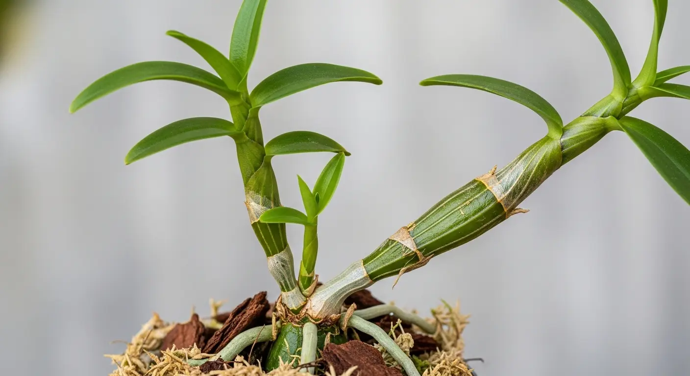 デンドロビウムの花が終わり、少し寂しい姿になると、多くの人が「古い茎(バルブ)を切り詰めてスッキリさせたい」という衝動に駆られます。しかし、これは「ほったらかし」栽培における最大の落とし穴の一つです。花が終わった後の古いバルブは、絶対に切らないでください。一見すると枯れたように見えるかもしれませんが、この古いバルブには、翌年の新芽を育てるための水分や栄養分が豊富に蓄えられています。まさに、植物自身が持つ「栄養のバッテリーパック」なのです。花が終わったら、行う作業はただ一つ。しぼんだ花がらを一つひとつ摘み取るか、花が付いていた短い花茎を根元から切り取るだけです。バルブ本体には決してハサミを入れないようにしましょう。この栄養タンクを残しておくことで、デンドロビウムは少ない肥料でも力強く成長することができます。古いバルブは2~3年間は新芽に栄養を送り続ける大切な役割を担っています。完全にシワシワになり、茶色く枯れてしまったものだけを取り除けば十分です。古いバルブを大切にすることが、少ない手間で毎年花を咲かせるための、賢い「ほったらかし」の秘訣なのです。