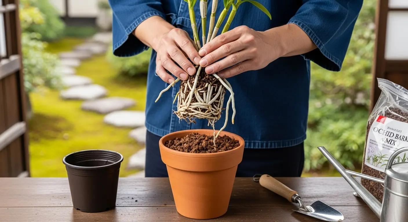 デンドロビウムの植え替えは、毎年行う必要のない、まさに「ほったらかし」向きの作業です。植え替えの目安は2~3年に1回で十分です。植え替えが必要かどうかは、鉢の状態を見れば判断できます。鉢底の穴から根がたくさん飛び出している、水を与えてもなかなか染み込まなくなった、株が大きくなって鉢が不安定になった、といったサインが見られたら植え替えのタイミングです。最適な時期は、花が終わって新芽が動き出す4月~5月頃です。手順は驚くほど簡単です。まず、現在の鉢より一回りだけ大きい鉢を用意します。鉢から株をそっと抜き、黒く腐った根やスカスカになった古い根だけを清潔なハサミで切り取ります。このとき、健康な白い根を傷つけないように、無理に根鉢を崩さないのがポイントです。新しい鉢に株を据え、隙間に新しい植え込み材(水ゴケやバークなど)を詰めていくだけです。そして、植え替え後の一番大切な注意点は、すぐに水を与えないこと。植え替えから1週間~10日ほどは水やりを控え、傷ついた根が乾いて回復するのを待ちます。この静養期間が、その後のスムーズな活着につながります。