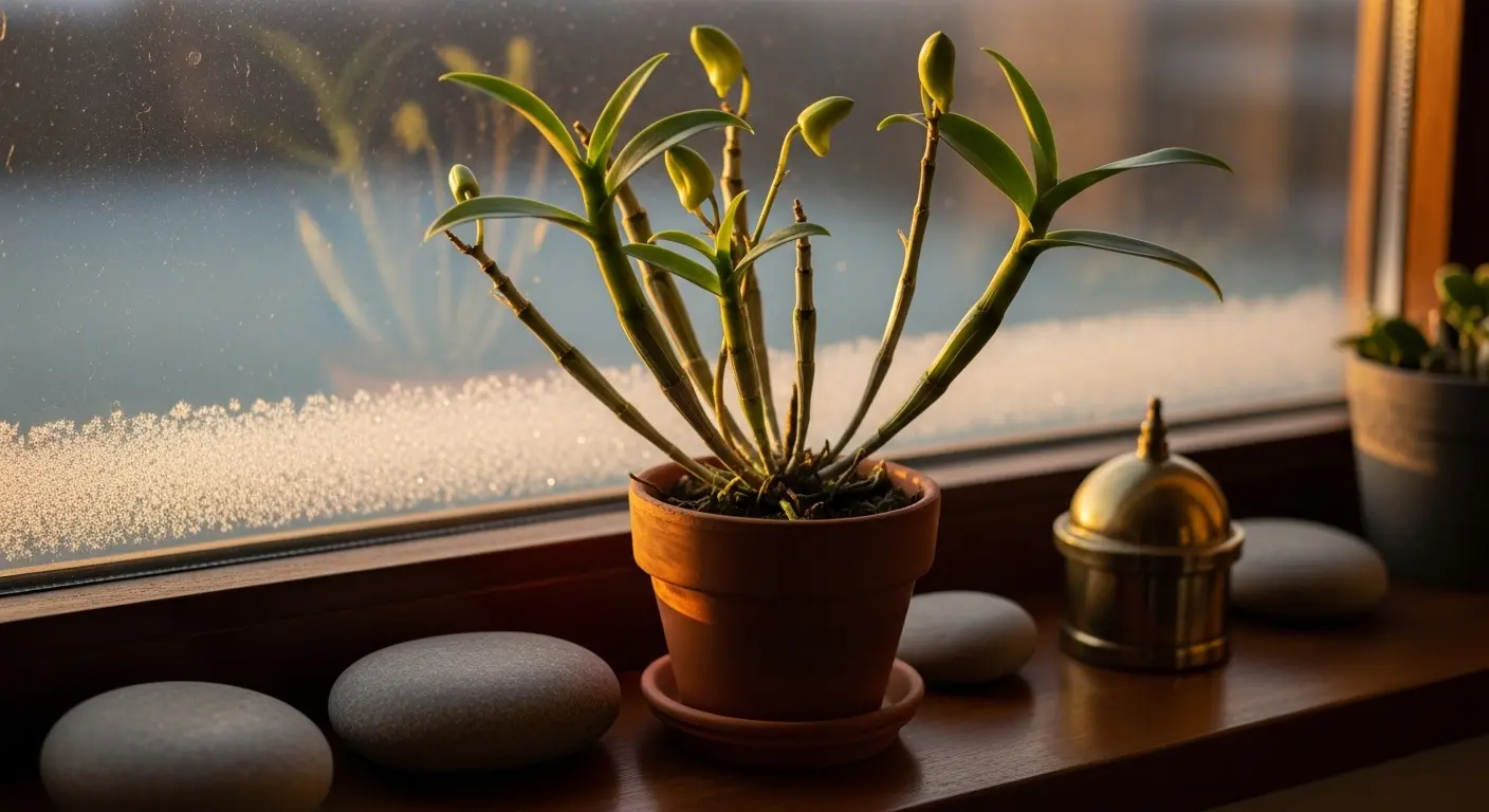 デンドロビウムの開花において、クライマックスとも言えるのが冬の管理です。夏に肥料を止め、秋に日光をたっぷり浴びて充実したバルブは、いよいよ花芽を作る最終段階に入ります。その引き金を引くのが、冬の「寒さ」と「乾燥」です。これこそが、開花の成否を分ける「ほったらかし」の真骨頂と言えるでしょう。デンドロビウムの花芽が分化するためには、夜間の最低気温が15℃以下、できれば10℃前後の低温に20~25日程度遭遇させる必要があります。そのため、冬は室内に取り込んだ後も、暖房が効いた暖かい部屋ではなく、日当たりの良い窓辺など、夜間に自然な寒さを感じられる場所に置くことが非常に重要です。そして、この時期の水やりは徹底的に控えます。鉢の中が完全に乾いてから、さらに数日経って、バルブに少しシワが寄るくらいまで我慢してから、ごく少量の水を与える程度にします。目安としては10日~2週間に1回程度です。この「寒くて乾いている」という、植物にとっては少し過酷な環境が、「子孫を残さなければ!」というスイッチを入れ、バルブの節々に花芽を形成させるのです。愛情のつもりの過保護な水やりや暖房は、かえって開花を妨げます。冬の適切な「ほったらかし」こそが、春に見事な花を見るための最も重要な秘訣なのです。