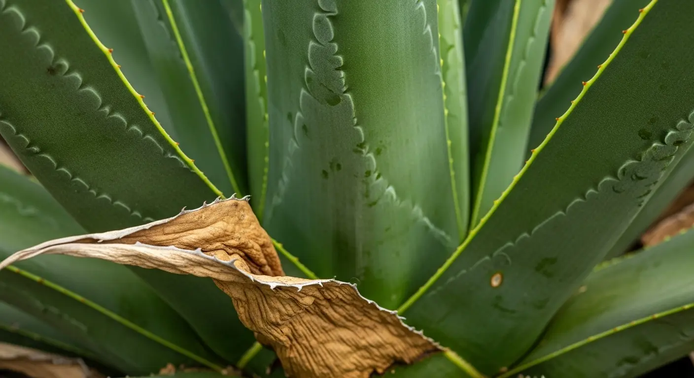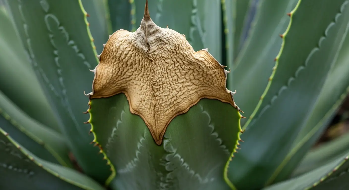 水切れのサインとして、下葉が枯れてくることも挙げられます。葉のシワがさらに進行し、水分不足が続くと、アガベはより積極的に自己防衛を始めます。それは、株全体の水分蒸散量を減らすために、自ら下葉を枯らして切り離すという生存戦略です。最初は黄色く変色し、やがて茶色くカサカサになって、最終的には完全に枯れてしまいます。これは、限られた水分を新しい成長点に集中させるための、賢明な判断なのです。