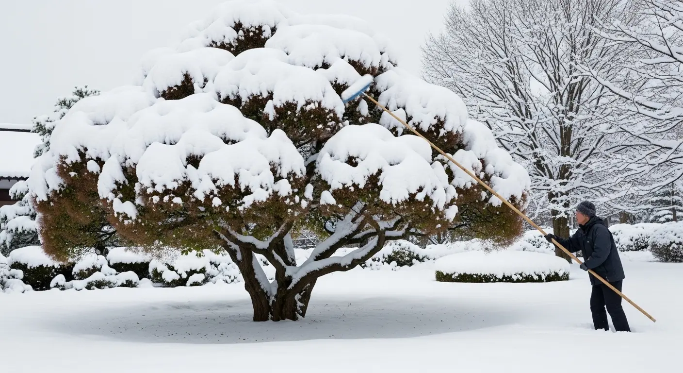 雪が積もった場合は、放置せずに、なるべく早めに竹竿などで優しく揺すって雪を落としてあげましょう。枝が凍っている時に無理に力を加えると逆に折れやすくなるため、慎重に行ってください。心配な場合は、あらかじめ枝を縄で軽く束ねておく「雪吊り」のような対策も有効です。