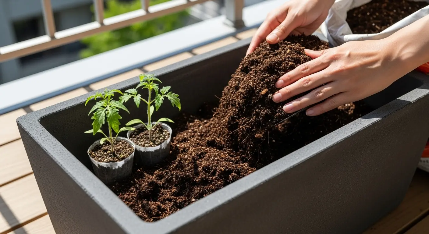 土をプランターに入れる際は、まず鉢底石を敷いた後、一度半分ほど土を入れ、水をたっぷりとかけて土に水分を吸収させます。その後、残りの土をプランターの縁から2~3cm下のウォータースペースを残して入れ、再度水をしっかり与えることで、土全体が均一に湿り、苗が馴染みやすくなります。