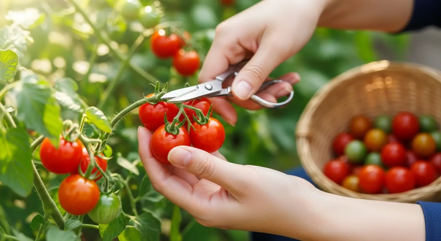 栽培がいよいよ終盤に差し掛かり、たくさんの実が色づき始めたら、最後の一手間で収穫の質と量をさらに高めることができます。その作業が「摘心(てきしん)」です。摘心とは、主茎の先端(生長点)を摘み取ることで、それ以上の背丈の成長を止め、残った実を充実させるために栄養を集中させる作業です。一般的には、支柱の先端まで茎が達した頃や、6~7段目の花房が咲いた頃に行います。これにより、秋になってからついても熟す見込みのない実に栄養が使われるのを防ぎ、収穫できるすべての実を美味しく熟させることができます。収穫のタイミングは、ヘタの付け根まで果実全体が真っ赤に色づいたときがベストです。ミニトマトは収穫後にはあまり追熟しないため、樹になった状態で完熟させるのが美味しくいただくコツ。収穫が遅れると実が割れてしまう「裂果」の原因にもなるので、採り遅れには注意しましょう。収穫する時間帯は、果実の温度が上がる前の涼しい朝のうちがおすすめです。朝採れのミニトマトは、みずみずしさが格別です。ハサミを使って、ヘタを少し残して一粒ずつ丁寧に収穫しましょう。