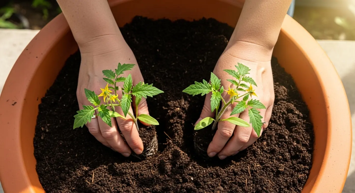 いよいよ苗の植え付けです。2株を1つのプランターに植える際には、いくつかの重要なコツがあります。これを知っているかどうかで、後の管理のしやすさや病気の発生率が大きく変わってきます。まず、2株の株間(かぶま)、つまり苗と苗の間隔は30~40cmほどあけましょう。株間が狭すぎると、葉が茂ったときに風通しが悪くなり、病害虫の温床になってしまいます。次に、ポットから苗を優しく取り出します。このとき、根鉢(ねばち)と呼ばれる根と土が固まった部分は、絶対に崩さないように注意してください。根を傷つけると、苗が弱る原因になります。そして、ここがプロの技。ミニトマトの花房は、必ず同じ方向に付く性質があります。この性質を利用し、2株の花房がそれぞれプランターの外側を向くように配置して植え付けます。こうすることで、実がプランターの外側に向かって育つため、株の中心が混み合わず、日当たりと風通しが確保できます。さらに、収穫作業も格段にしやすくなるのです。植える深さは、ポットの土の表面がプランターの土の高さと同じか、少し高くなるくらいの「浅植え」が基本です。植え付けが終わったら、プランターの底から水が流れ出るまで、たっぷりと水を与えてください。