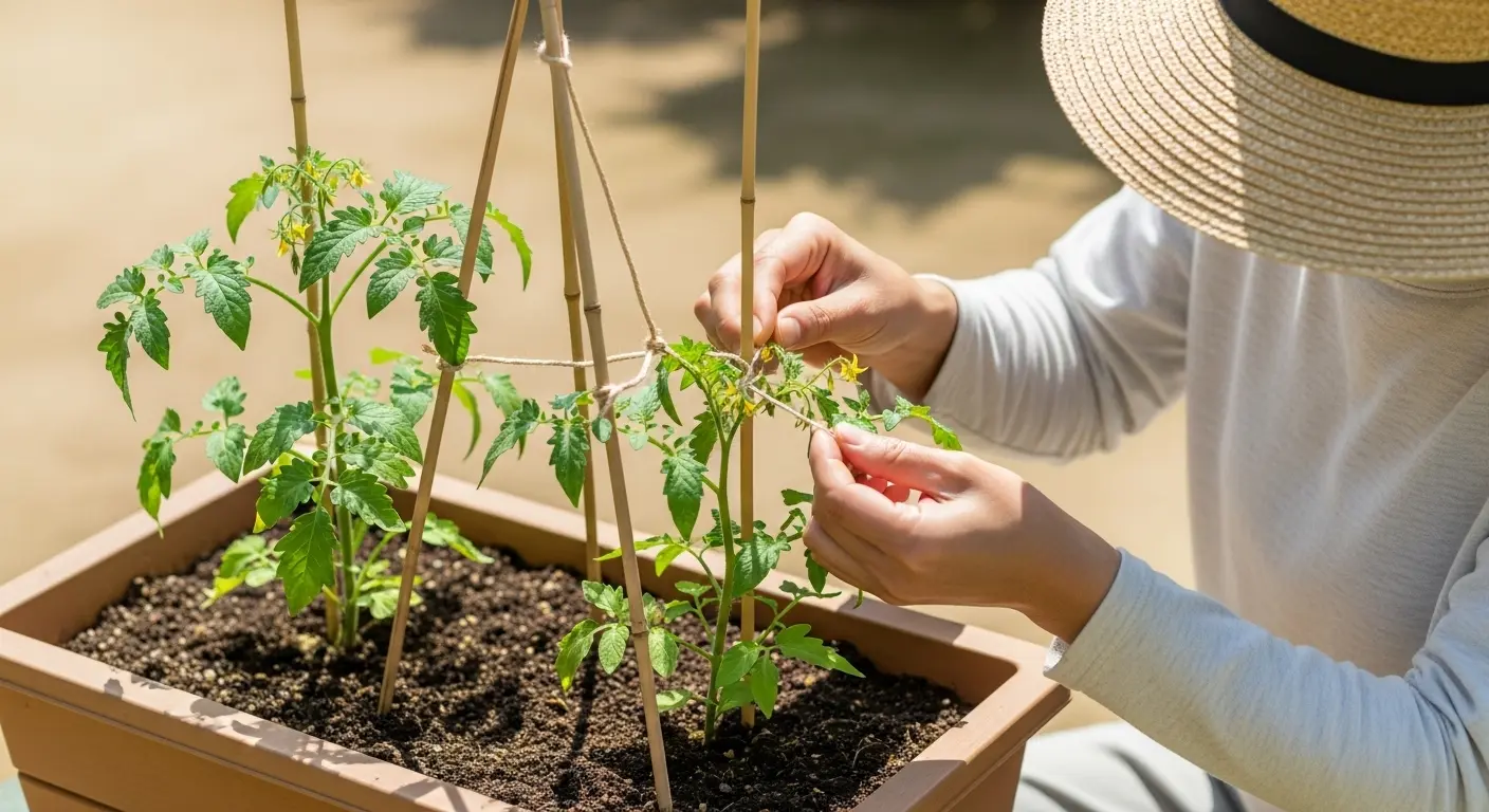 ミニトマトは成長すると草丈が1.5m以上にもなり、たくさんの実をつけるとかなりの重さになります。そのため、株をしっかりと支える支柱立ては必須の作業です。植え付け後、苗が少し落ち着いたタイミングで、なるべく早めに支柱を立てましょう。草丈が30~40cmになる頃までには設置するのが目安です。2株を1つのプランターで育てる場合、最も安定感がありおすすめなのが「合掌造り(がっしょうづくり)」という立て方です。これは、プランターの両端に、それぞれ150~180cm程度の支柱を内側に傾けるように斜めに差し込み、上部で交差させて固定する方法です。この三角形の構造が、横風などに対して非常に高い安定性を発揮します。支柱を差す位置は、根を傷つけないように株元から5~10cmほど離した場所にしましょう。株が成長してきたら、茎を支柱に誘引していきます。このとき、麻ひもなどを使い、茎と支柱を「8の字」になるように結びつけます。こうすることで、茎が太くなってもひもが食い込まず、植物の成長を妨げません。結ぶ際には、少しゆとりを持たせるのがポイントです。誘引は、株の成長に合わせて20~30cm間隔で定期的に行いましょう。
