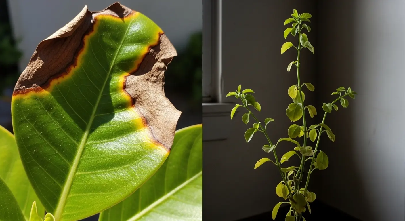 もう一つの原因が、その逆の「葉焼け」です。暗い場所から急に強い光に当てたり、特に夏の直射日光や強い西日が当たったりすると、人間の肌が日焼けするように、葉が焼けてしまいます。葉焼けした部分は、黄色や茶色に変色し、パリパリになって枯れてしまいます。特に剪定後に出てきた柔らかい新芽は、葉焼けしやすいので注意が必要です。