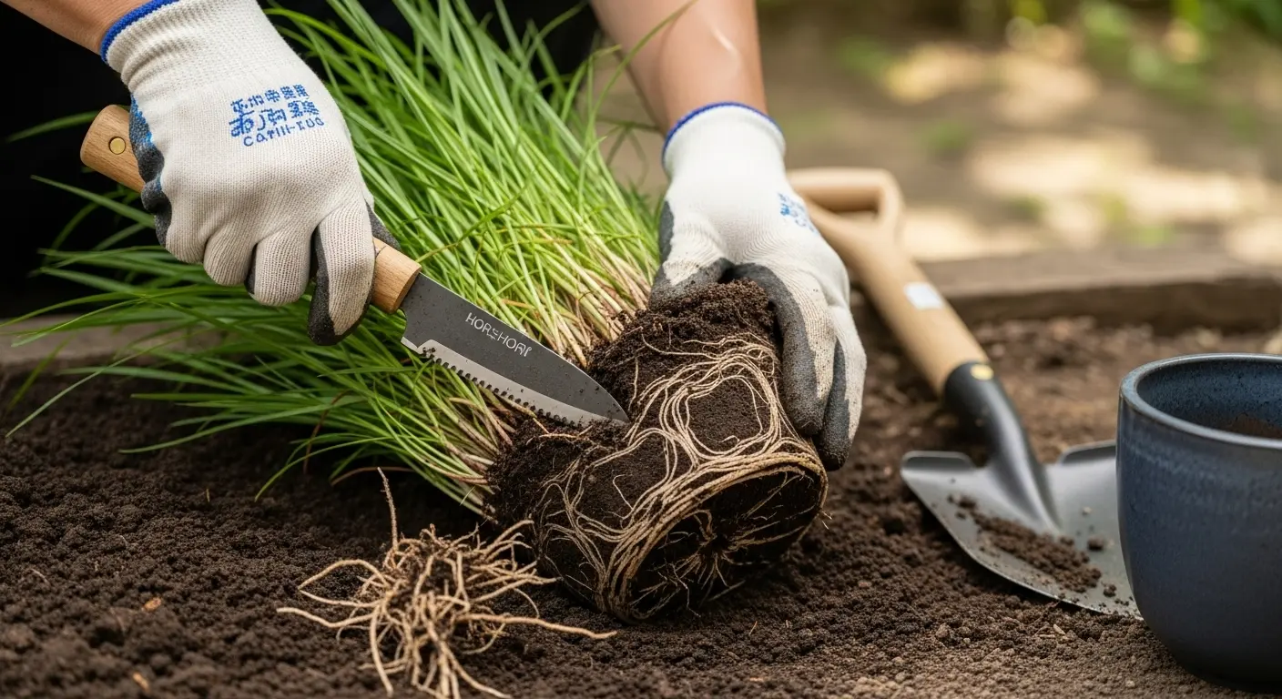 - 株分けには、スコップと「鋭利なナイフ」が必要である