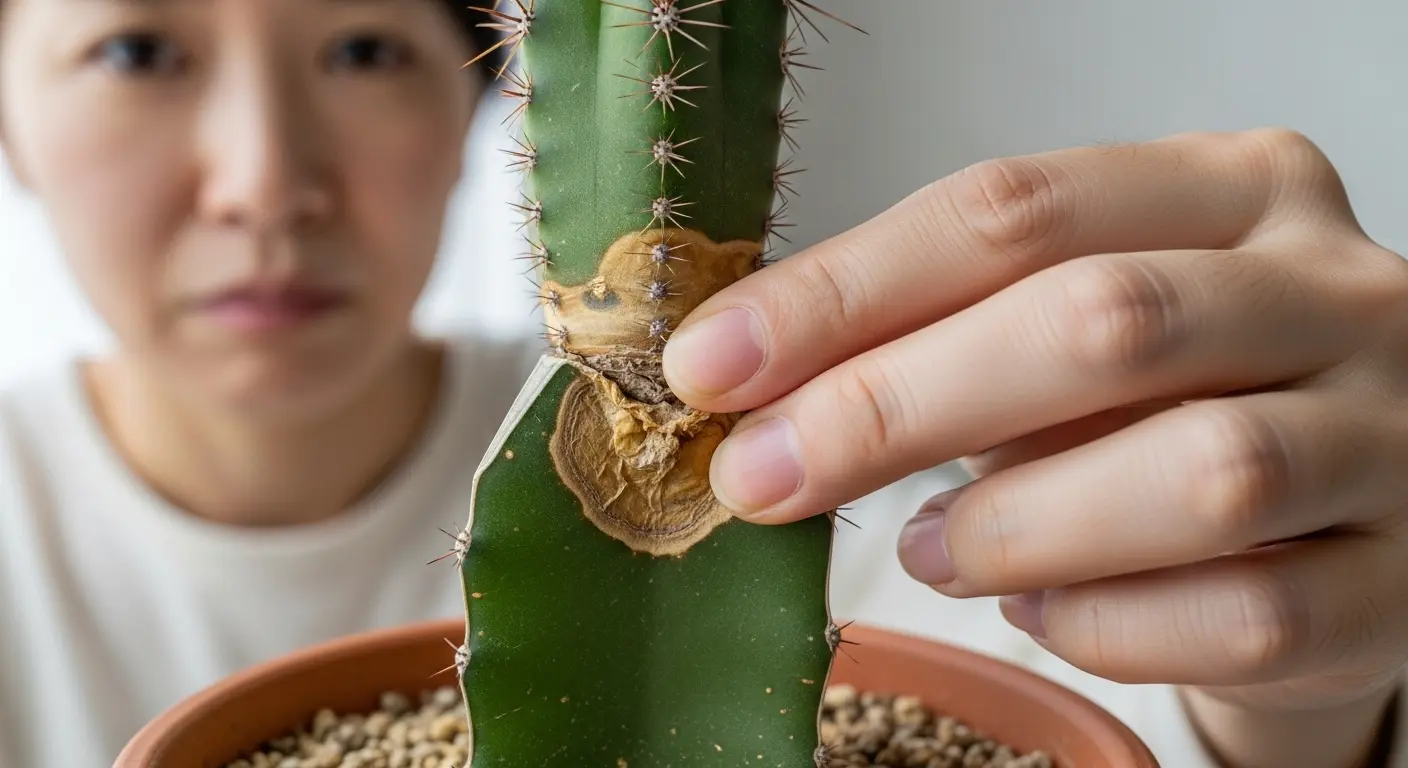 サボテンが「ぶよぶよ」している場合、それは内部の組織が菌によって溶かされ、空洞になっている状態かもしれません。こうなると非常に危険です。健康なサボテンは、カチカチに硬いものです。日頃から触って、その「硬さ」を覚えておくことも大切です。