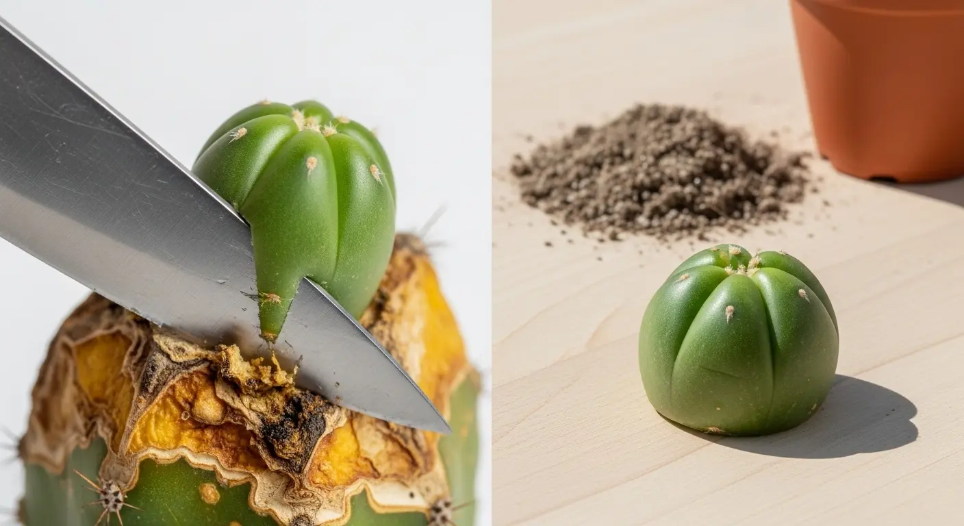 1. 切断:清潔でよく切れるカッターやナイフ(アルコールで消毒する)を使います。サボテンのぶよぶよした部分と、健康な緑色の部分の「境目」よりも、少し上を水平に切断します。
