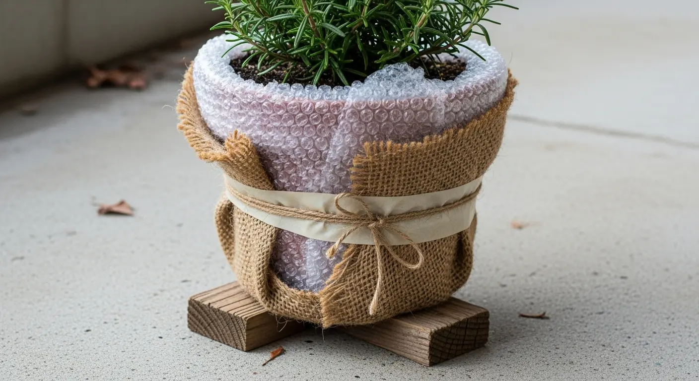 最も効果的なのは「鉢の保温」です。ホームセンターなどで売っているプチプチ(気泡緩衝材)や不織布(ふしょくふ)、古い毛布などを鉢の周りに2~3重に巻き付け、紐で縛っておくだけで、根が凍るのを劇的に防げます。見た目を気にする場合は、一回り大きな鉢カバーや木箱に入れ、その隙間に落ち葉やバークチップを詰めるのも良い方法です。