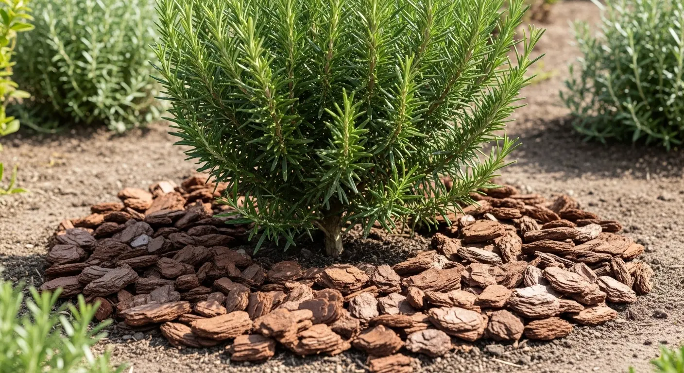 資材としては、腐葉土(ふようど)やバークチップ、ワラなどが一般的です。これらを、冬本番で土が凍り始める前に、株元を中心に厚さ5cm~10cmほど敷き詰めます。ただし、ここで注意点があります。ローズマリーは「過湿」を嫌うため、株の幹に直接マルチング材がベッタリと触れていると、そこから腐りや病気が発生する可能性があります。資材を敷く際は、幹の周囲を少し開けて「ドーナツ状」に敷くと、通気性が保たれて安心です。
