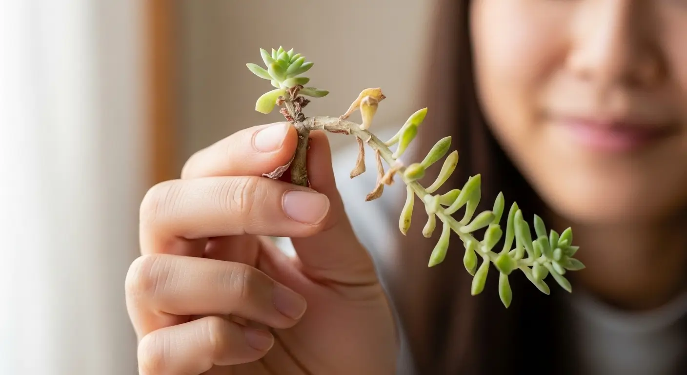 葉挿し用の葉は、茎からちぎり取るのではなく、左右に優しく揺らして、葉の付け根の「成長点」を潰さないように取り外すのが成功のコツです。芽が出るまで水やりは不要。根気よく待つことが大切です。