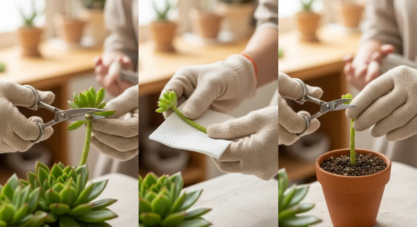 挿し穂の切り口が乾いたら、用意しておいた「乾いた多肉植物用の土」に挿します。この時点ではまだ根がないため、挿し穂が倒れない程度の深さ(2~3cm)まで挿せば十分です。