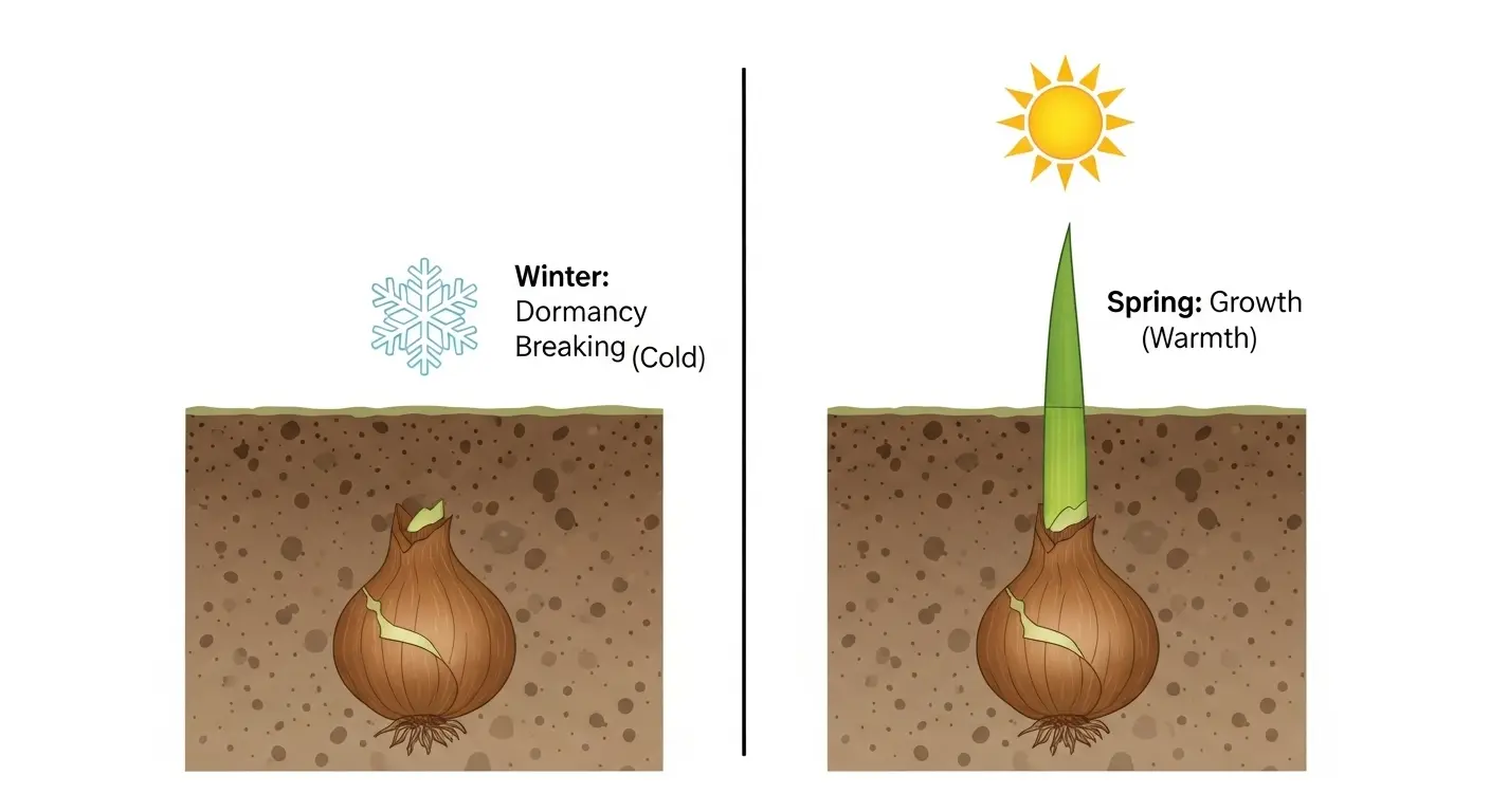 1. ステップ1(冬):球根が地中で一定期間の寒さ(低温)を経験し、休眠打破する。