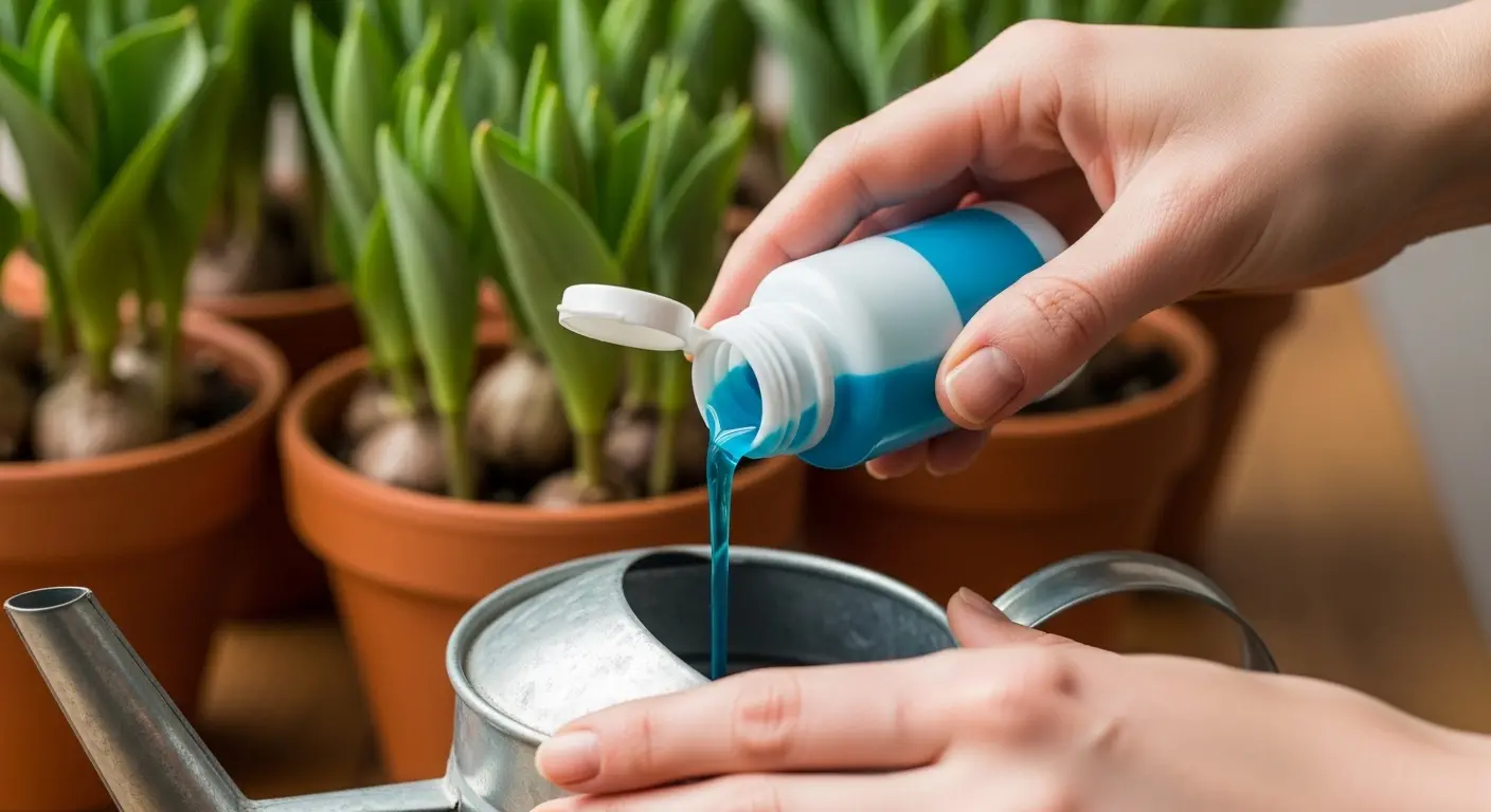 芽が出始めたら、2週間に1回程度、規定の倍率に薄めた液体肥料(えきたいひりょう)を与え始めます。これを、花が咲き終わり、葉が枯れ始める5月ごろまで続けます。