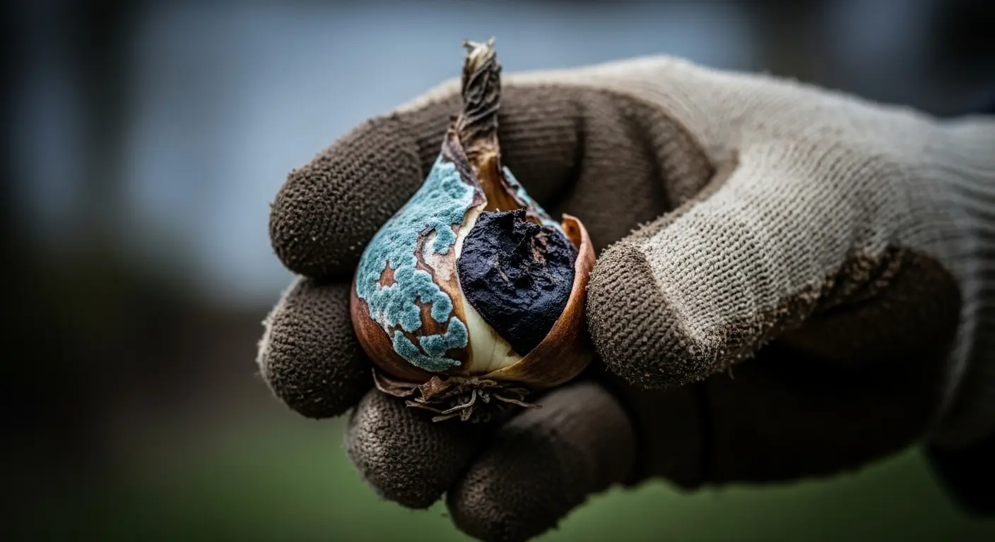 球根が腐る原因は、カビ(病菌)です。球根に黒や青のカビが生えたり、あざのようなくぼみができたりし、やがて軟らかく腐ってしまいます。