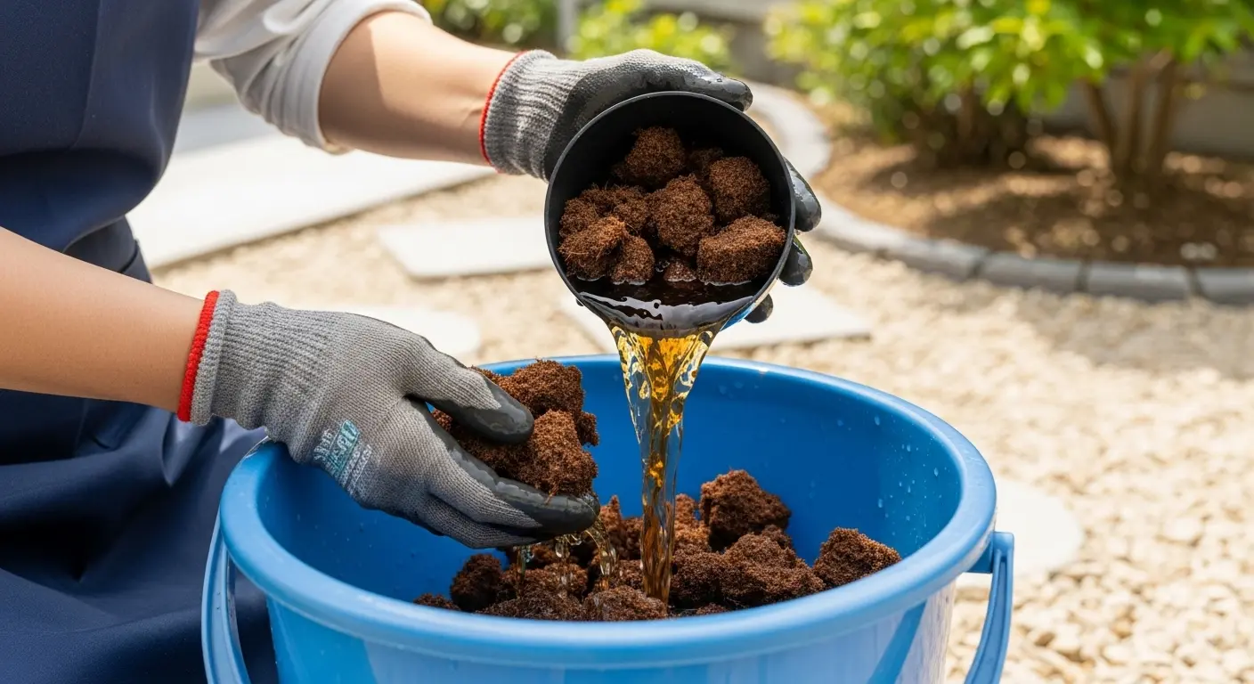 - バケツなどの容器にココピートを入れ、たっぷりの水を注ぎます。(圧縮ブロックは水で戻します)