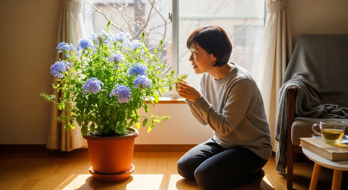 鉢植えのルリマツリは、冬になったら室内に取り込むようにしてください。室内では、できるだけ暖かい部屋に置き、夜間は窓際での冷え込みによる凍結を防ぐため、部屋の中央など、最低5℃以上を保てる場所に移動させると安心です。