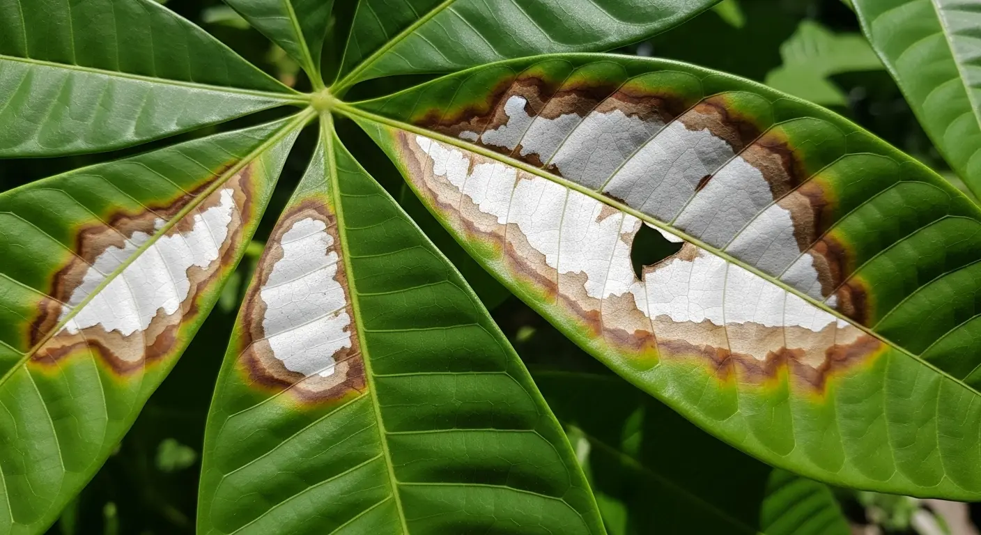 「植物には日光が必要」というのは正論ですが、強すぎる日差し、特に真夏の直射日光や、長い間室内で管理していた株を急に炎天下に出した場合に起こるのが「葉焼け」です。人間で言うところの重度の火傷にあたります。葉の細胞に含まれる葉緑体が強い紫外線によって破壊され、光合成能力を失い、組織が壊死してしまいます。