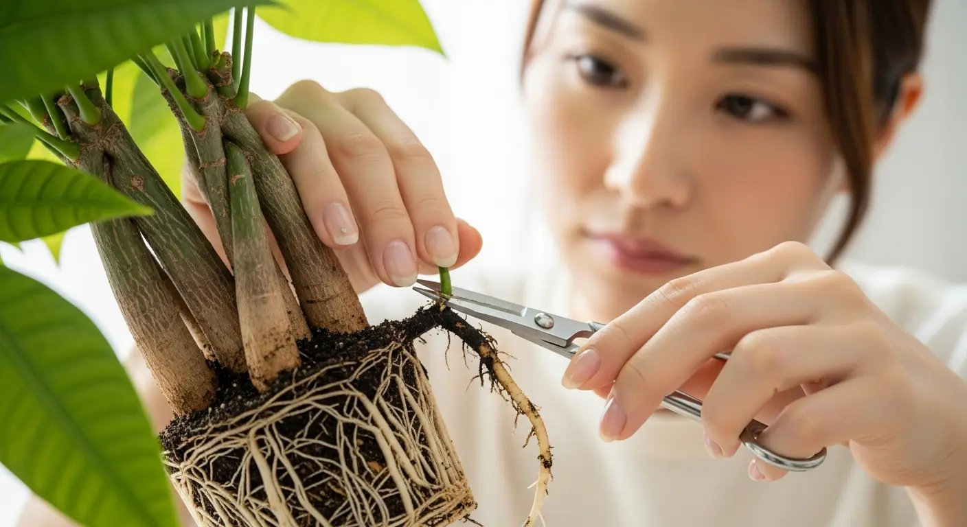 清潔なハサミ(火で炙るかアルコール消毒したもの)を使い、腐った根を全て切り落とします。腐敗部分を残すとそこから菌が再び広がるため、健康な白い根が見えるところまで大胆に切り詰める必要があります。もし茎の根元まで黒く変色していたら、さらに上の、断面が白くて綺麗な緑色をしている健康な部分まで茎を切り戻す(胴切りする)必要があります。「こんなに切って大丈夫?」と不安になるかもしれませんが、腐った部分を残す方が致命的です。金のなる木は生命力が強いため、健康な部分が残っていれば再生可能です。