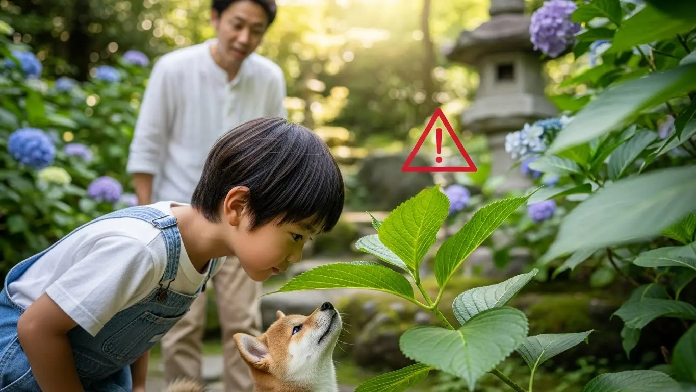 特に注意が必要なのは、犬や猫などのペットを飼っているご家庭です。散歩中や庭で遊んでいる最中に、興味本位でアジサイの葉をかじってしまう誤食事故が実際に報告されています。中毒症状としては、激しい嘔吐、下痢、ふらつき、過呼吸などが見られ、重篤な場合は痙攣(けいれん)や昏睡、最悪の場合は死に至るケースも考えられます。体格の小さい小型犬や猫、そして体重の軽い小さなお子様にとってはそのリスクはさらに高まります。過去には、料理の飾りとして添えられたアジサイの葉を人間が食べて食中毒を起こした事例も発生しており、厚生労働省なども注意喚起を行っています。