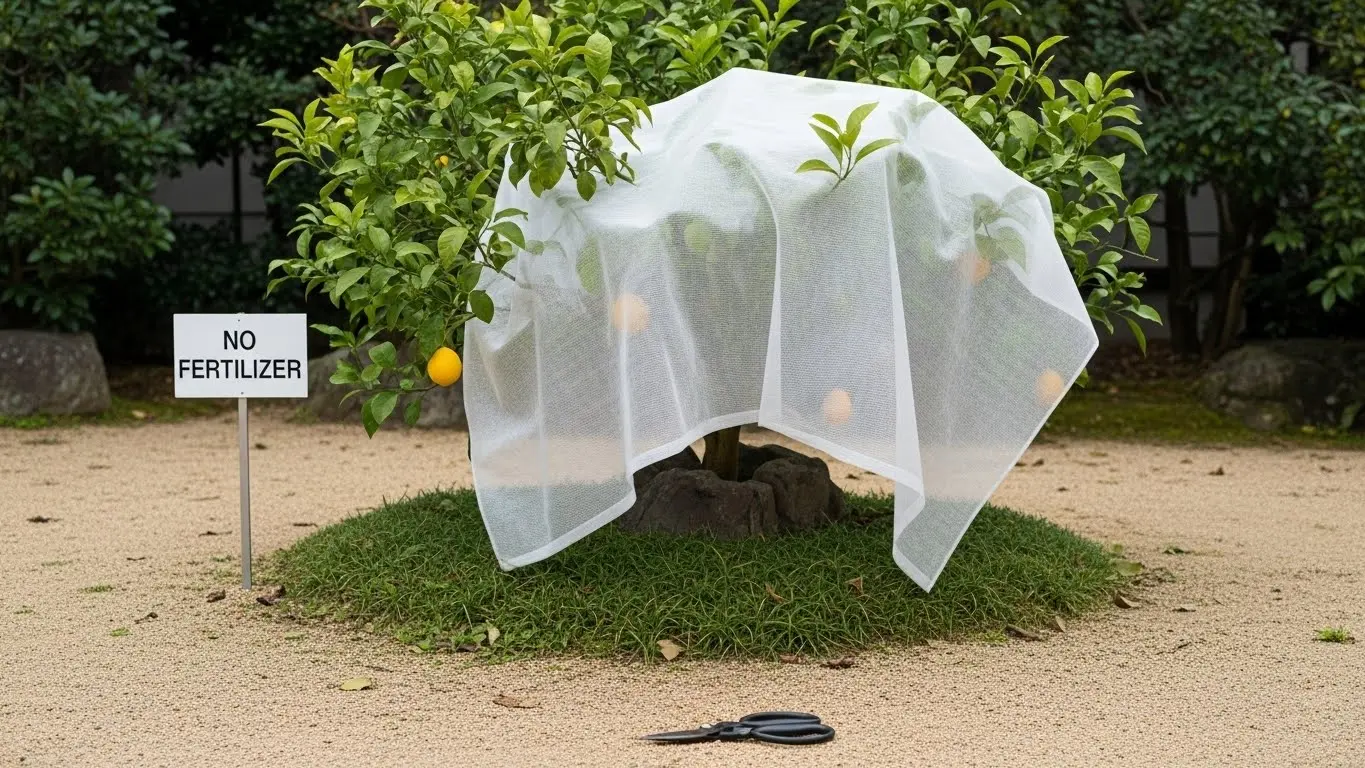 この時も、裾の部分は地面すれすれまで下ろし、ブロックや土、U字ピンなどでしっかりと地面に固定して、隙間風が入らないように密閉します。ただし、レモンにはトゲがある品種(リスボンなど)が多く、不織布がトゲに引っかかって破けやすいので注意が必要です。作業時は厚手の皮手袋をし、必要であればトゲの先端を少しカットしてから作業を行うとスムーズです。地植えの場合は、特に北側からの風を遮ることが重要なので、木の北側に寒冷紗などで防風ネットを張るのも、体感温度を上げるための非常に有効な手段となります。