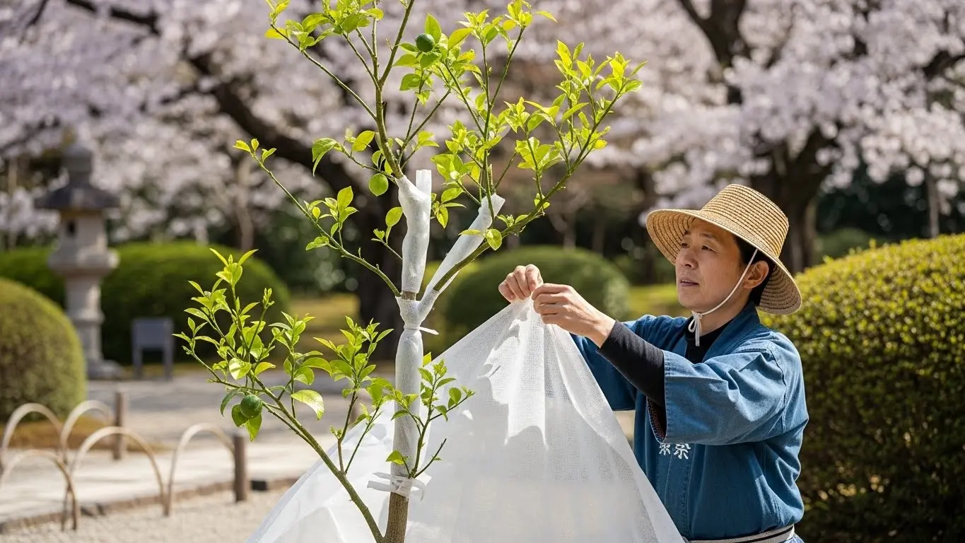 動かすことのできない地植え(庭植え)のレモンには、日本の伝統的な造園技術である「コモ巻き」や「腹巻き」の考え方を応用した対策が非常に効果的です。特に、まだ幹が細い若木にとって、水分を運ぶパイプラインである幹の凍結は、木全体の枯死に直結する重大事態です。