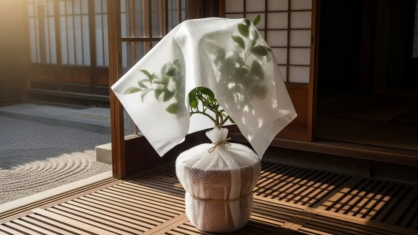 その点、不織布は繊維が複雑に絡み合ってできているため、適度な通気性と透水性があり、柔らかな光を通しながら霜と寒風をブロックできる理想的な素材です。選ぶ際は、あまりに薄すぎるもの(向こう側がはっきり透けて見えるようなもの)だと保温効果が心もとないため、厚手タイプを選ぶか、薄手のものを2重、3重にして空気の層を作って使うのがコツです。サイズは、木全体をすっぽりと余裕を持って覆える大きめのものを用意しましょう。固定用の園芸用クリップや麻紐も忘れずに準備してください。