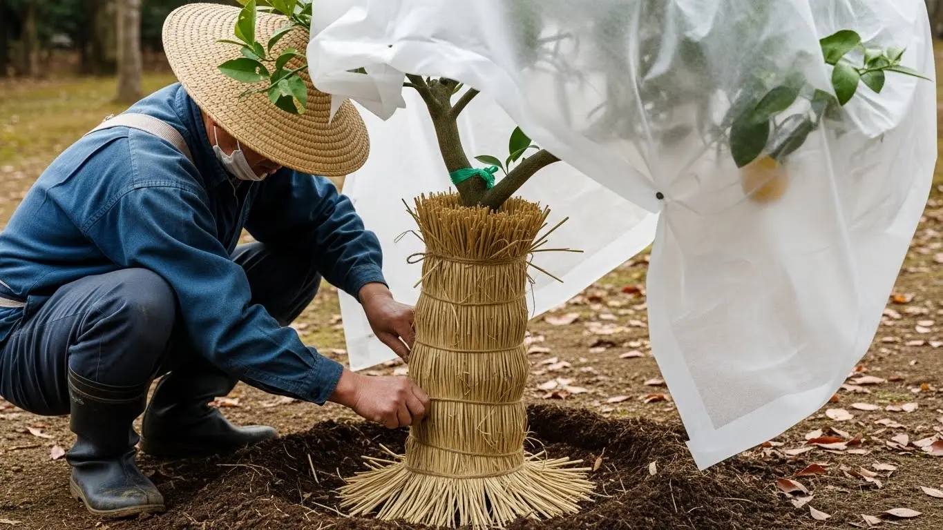 - 地植えの場合は、幹を藁や布で巻く「コモ巻き」と全体のカバーを併用する