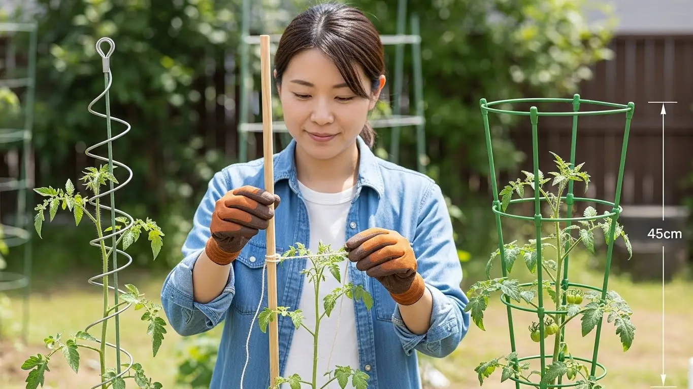 次に「リング支柱(行灯支柱)」ですが、これは通常、朝顔やクレマチスなどのつる性植物に使われるものです。しかし、ミニトマトの中でも「矮性(わいせい)」と呼ばれる、背丈があまり高くならず、横にこんもりと茂るタイプ(例:レジナ、ちびっこトマトなど)には最適です。これらの品種は通常の支柱なしでも育ちますが、実がつくと重みで枝が広がりすぎるため、リング支柱で囲ってあげることでコンパクトにまとまり、見た目も美しく管理できます。逆に、一般的な「アイコ」などの高く伸びる品種にリング支柱を使うのは不向きです。高さが足りず、すぐに天井を突き抜けてしまい、リングが邪魔をして手入れがしにくくなるからです。