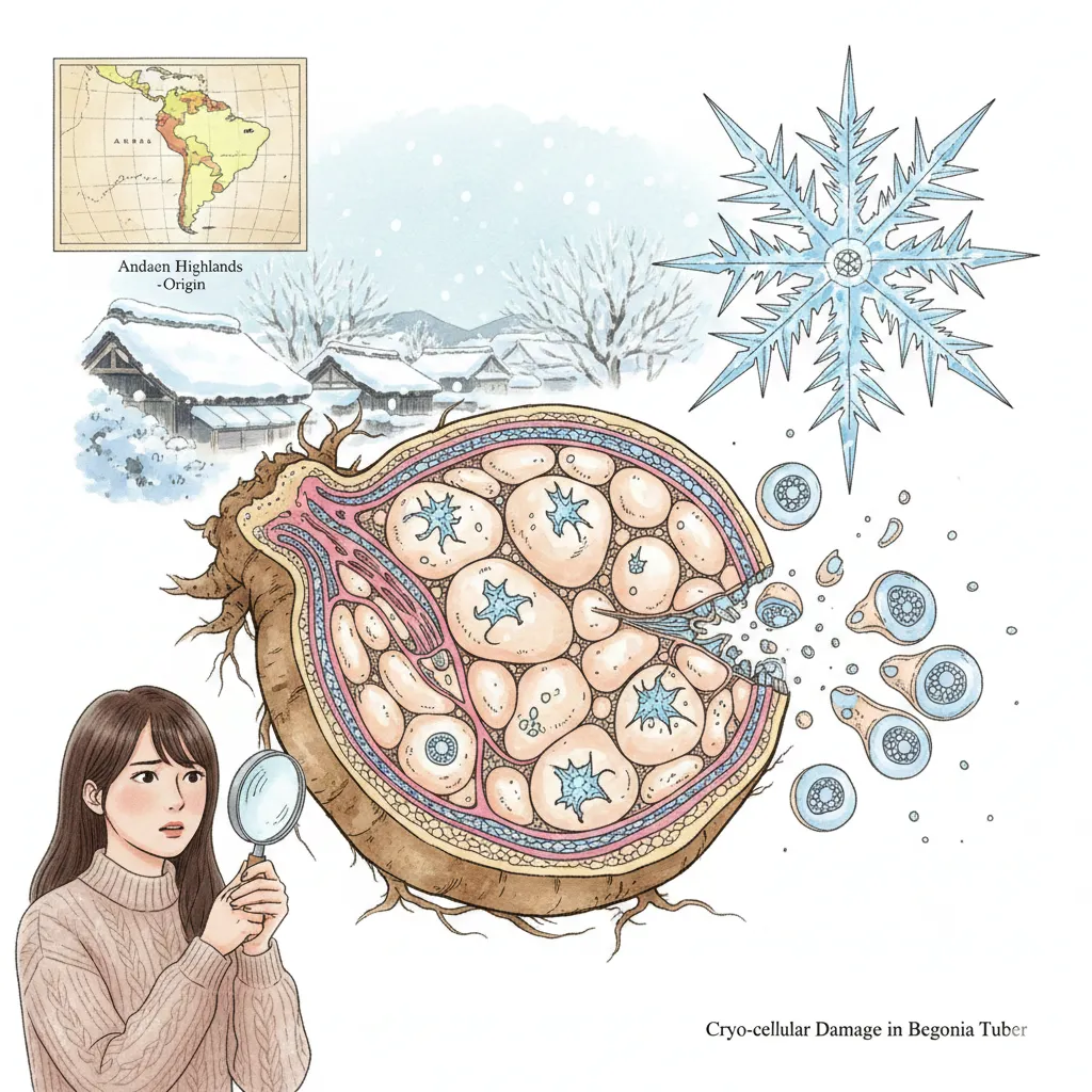 しかし、熱帯・亜熱帯の高地起源の性質を持つ球根ベゴニアには、この「凍結防止機能」が遺伝的に備わっていません。彼らの辞書に「凍結」という言葉はないのです。
