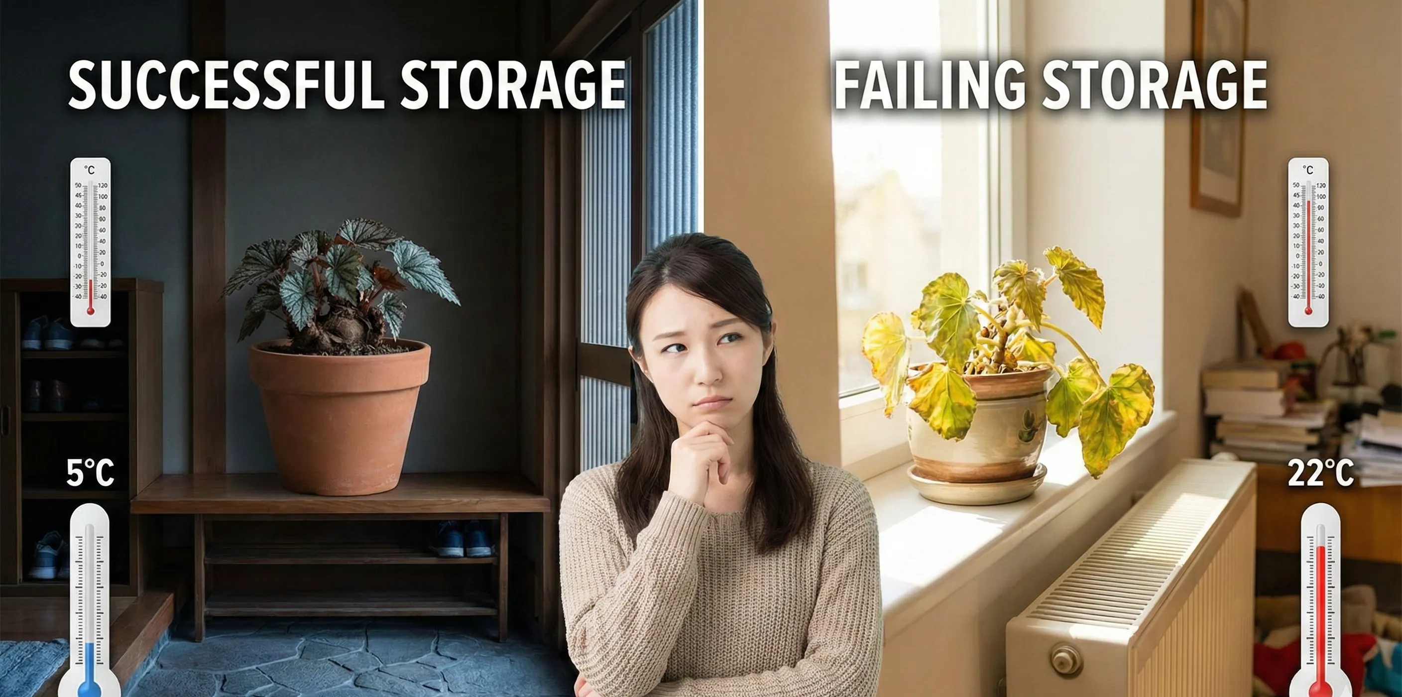 - 冬越しの保管場所は、5℃〜10℃程度の暗くて涼しい場所(玄関や北側の部屋)が最適。