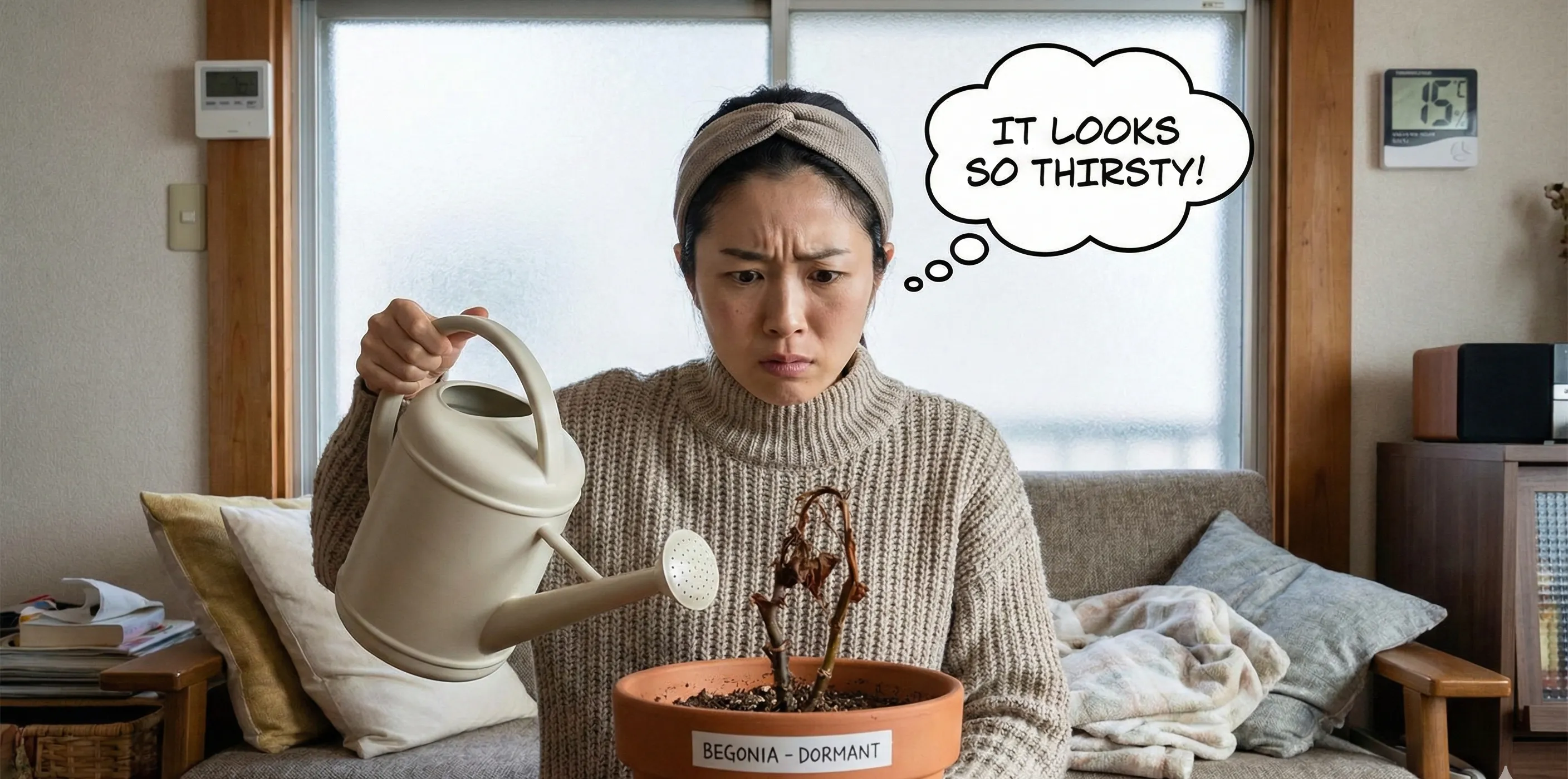球根ベゴニアの冬越しに初めて挑戦する方が最も陥りやすい失敗は、ズバリ「かわいそうだから」という親心による水やりです。「土がカラカラで枯れてしまうのではないか」「生きているか心配」という心理から、冬の間にコップ一杯の水をあげてしまう。