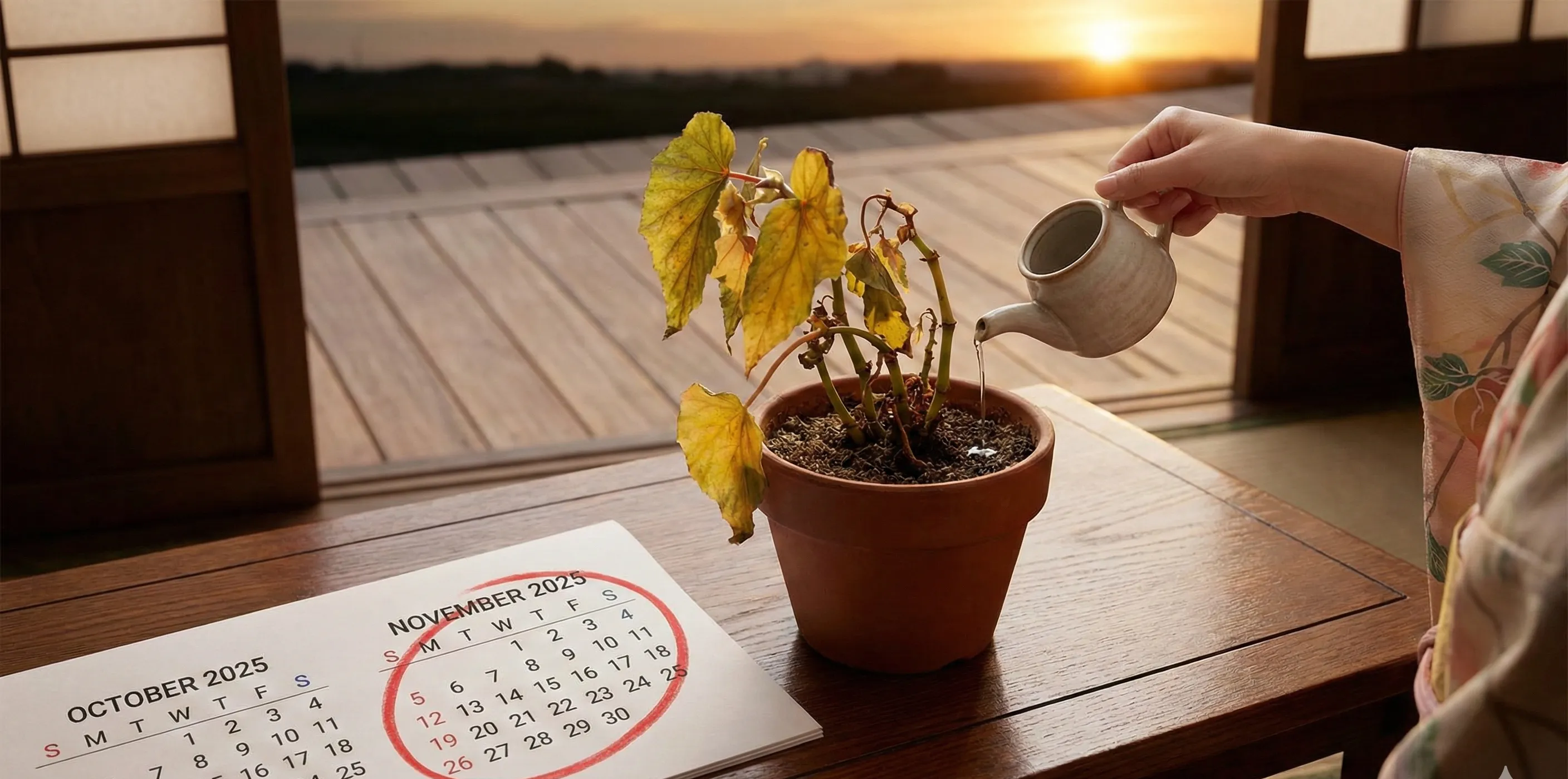 本日は2025年11月30日です。もし、あなたの球根ベゴニアがまだ屋外の雨ざらしの場所にあるなら、これは緊急事態です。今すぐに作業を開始する必要があります。本来、冬越しの準備(休眠への導入)は、気温が下がり始める10月下旬から11月上旬にかけて徐々に行うのが理想的でした。