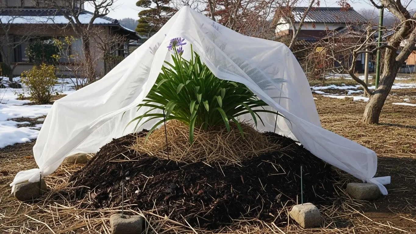 寒冷地や、暖地でも特に冷え込む場所でアガパンサスを守るための最強の手段が「マルチング」と「不織布」の活用です。これは植物に布団を掛けてあげるような作業で、地温の低下を防ぎ、霜柱によって根が持ち上げられて切れてしまうのを防ぐ効果があります。