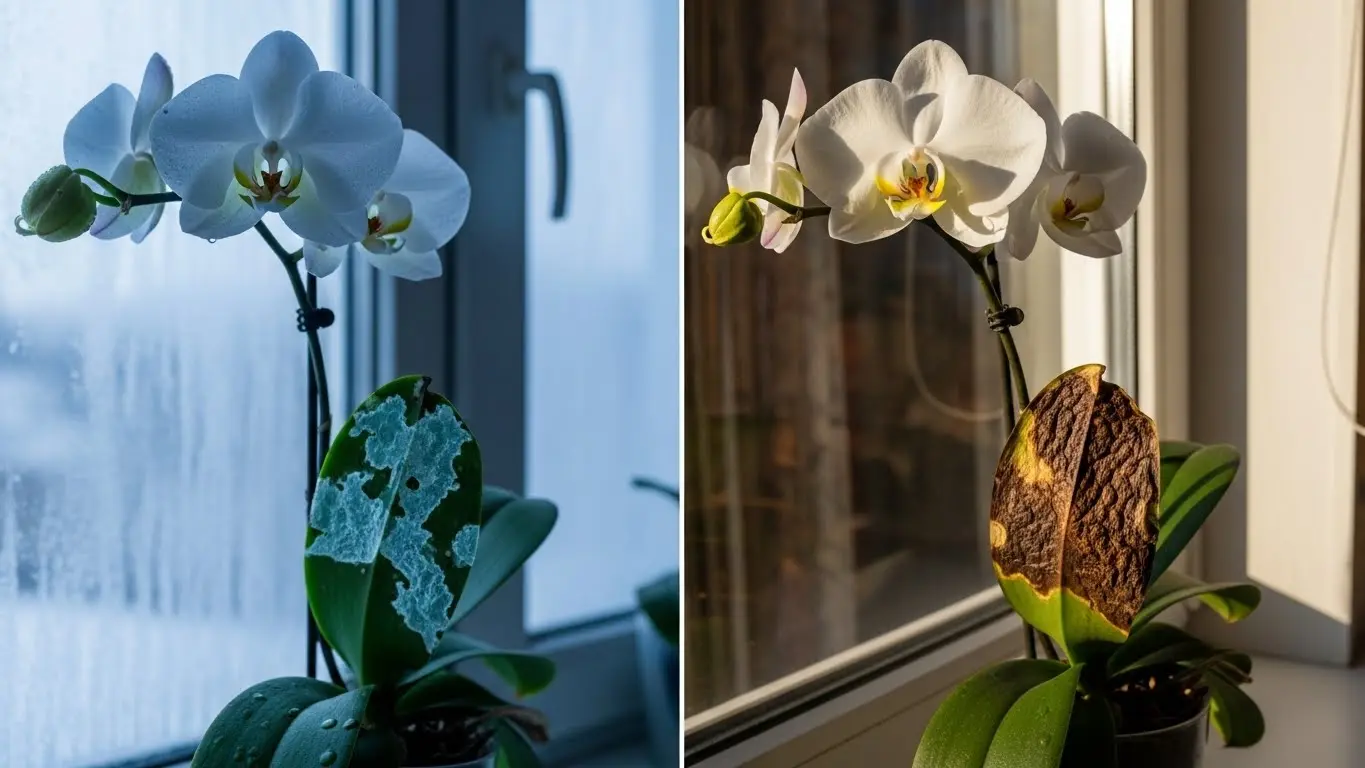 また、「葉焼け」も葉を傷める大きな要因です。胡蝶蘭は「木漏れ日」程度の柔らかい光を好みます。直射日光、特に春から秋にかけての強い西日などを長時間浴びると、葉の表面温度が急上昇し、細胞が破壊されます。