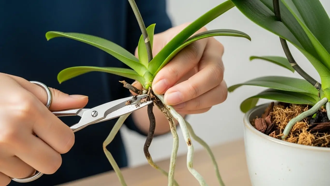 手順は以下の通りです。まず、鉢から株を優しく引き抜きます。古い水苔やバークをすべて取り除き、根を裸の状態にします。この時、黒く変色している根、触るとブヨブヨで中身がなく糸状になっている根は、すべて機能していません。