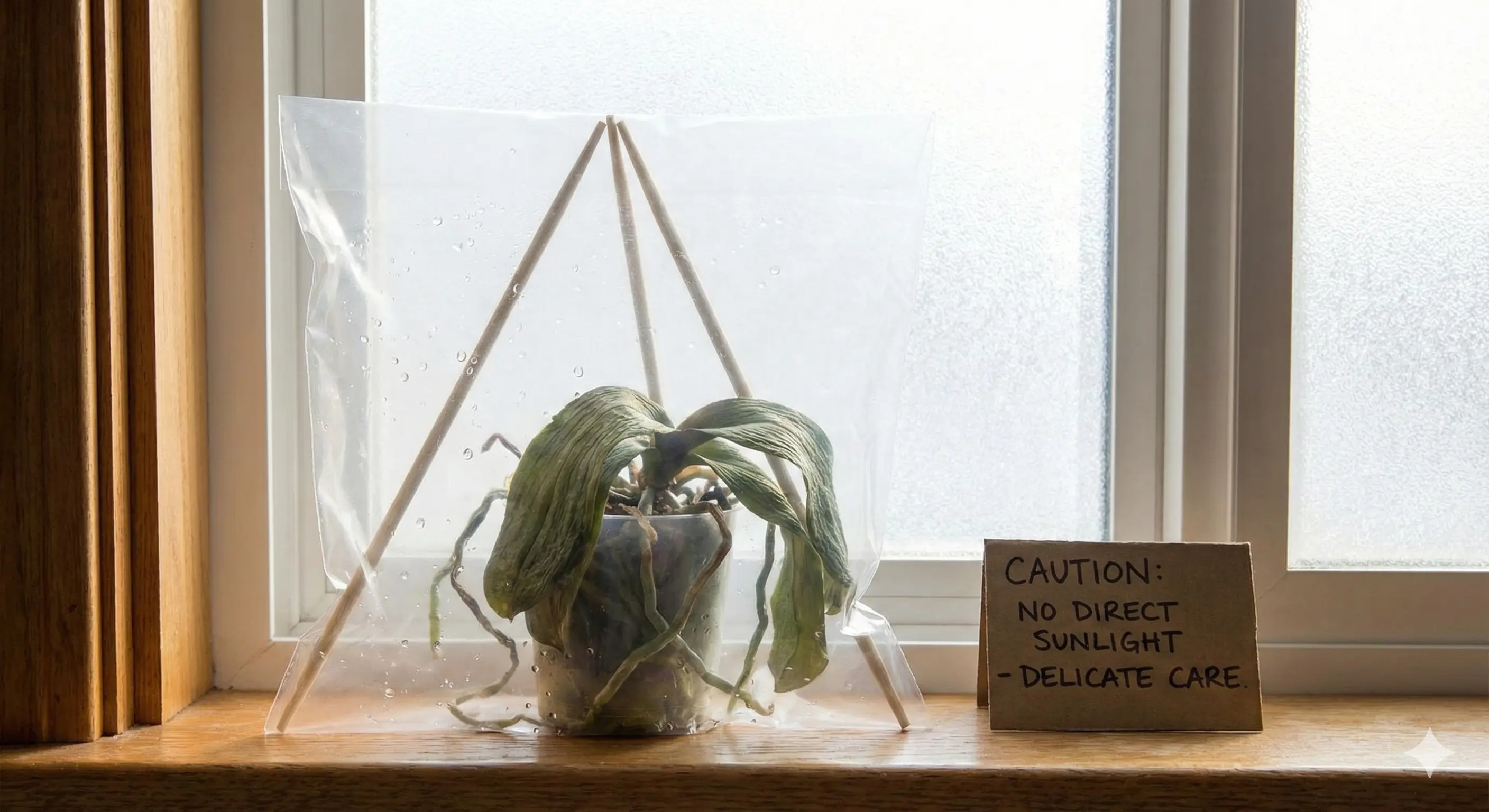 根がほとんど残っていない、あるいは葉がペラペラになるほど重度の脱水を起こしている場合の「最終手段」として、プロや愛好家の間で行われるのが「袋被せ(密閉法)」、通称「温室療法」です。これは、株全体を透明なビニール袋で覆うことで、袋の中の湿度を極限まで高め、葉からの蒸散を抑えつつ、わずかな根や気孔からの水分吸収を促す方法です。