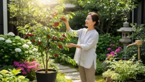 - 7月中旬〜8月上旬(剪定・お礼肥): 花後すぐに剪定を行います。遅れると翌年の花芽を切ってしまうので注意。剪定後に「お礼肥」を与えますが、ここでも赤・ピンク用の肥料を使います。